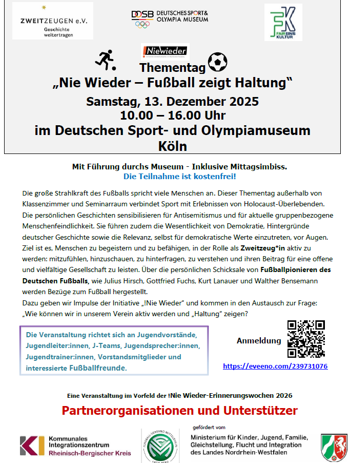 Thementag „Nie Wieder – Fußball zeigt Haltung“Samstag, 13. Dezember 2025 –10.00 bis 16.00 Uhr Deutsches Sport- und Olympiamuseum-Köln. Mit Führung durchs Museum – Inklusive Mittagsimbiss.Die Teilnahme ist kostenfrei! Die große Strahlkraft des Fußballs spricht viele Menschen an. Dieser Thementag außerhalb von Klassenzimmer und Seminarraum verbindet Sport mit Erlebnissen von Holocaust-Überlebenden.Die persönlichen
