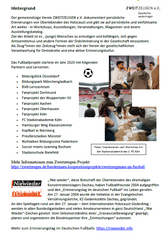 Gemeinsam mit euch möchten wir abseits von Klassenzimmern und Seminarräumen einen Thementag gestalten, der Fußball und Sport mit den (Über)Lebensgeschichten von Zeitzeug*innen des Holocausts verbindet.